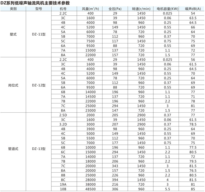 DZ系列低噪声轴流风机,采用低转速、较小轮毂比、高压力系数的设计方法,研制而成大弦长、空间扭曲倾斜式宽叶片。